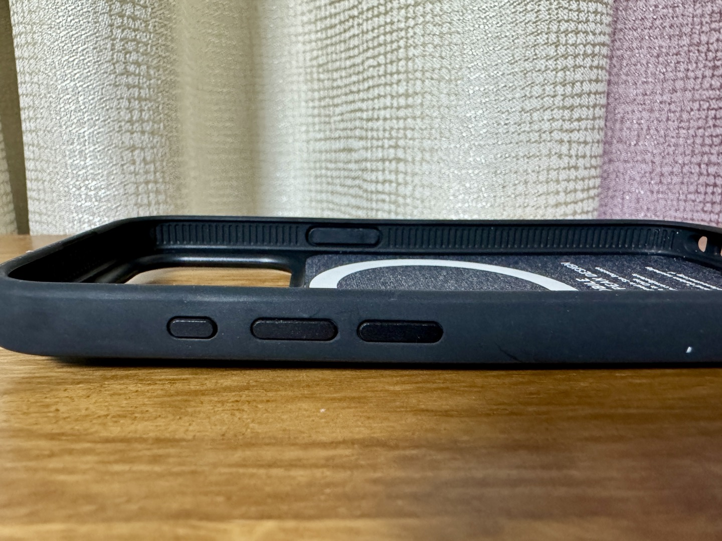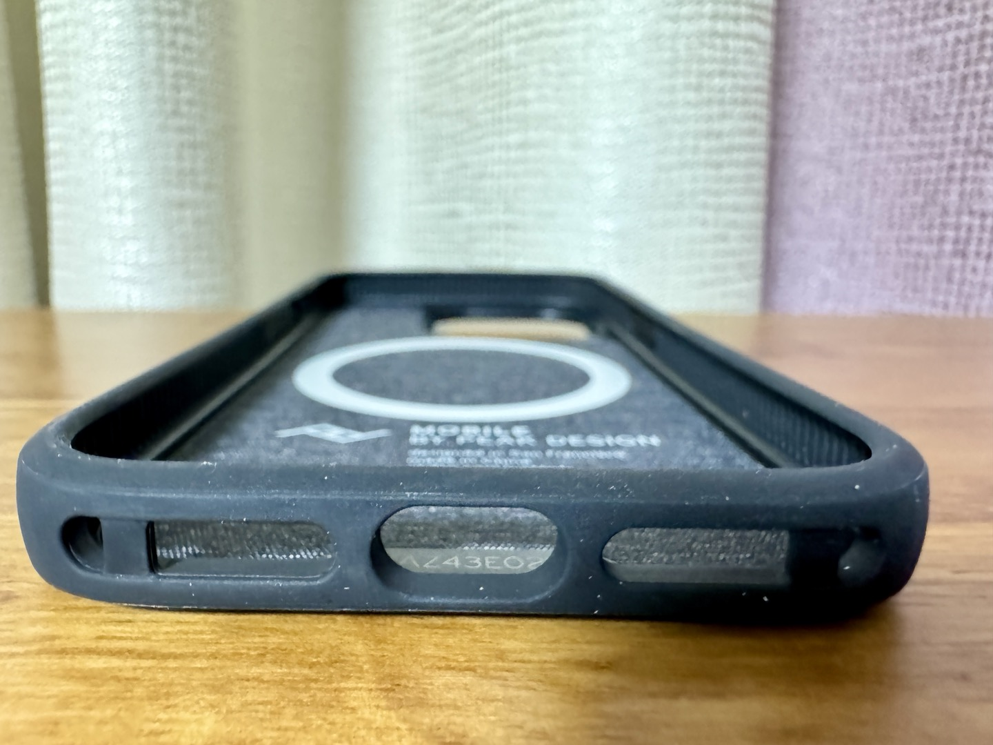 왼쪽 측면은 액션 버튼과 음량 조절 버튼이 케이스에 잘 덮여 있고 조작감도 좋았어요. 초기 버전의 케이스는 액션버튼이 뚫려 있었다고 하는데 현재 버전처럼 덮여 있는 게 좋은 것 같아요. 오른쪽 측면에는 마찬가지로 전원 버튼이 깔끔하게 덮여있어요. 하단의 스피커 홀과 C 타입 포트는 잘 오픈되어 있는 구조로 되어 있어서 사용성이 좋았어요.