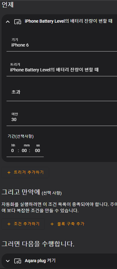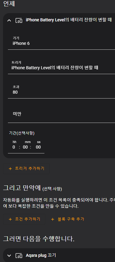 스마트 플러그가 등록되어 있는 IoT 플랫폼과 연동해서 사용이 가능한데 제 경우에는 Home Assistant에 스마트 플러그와 아이폰을 연동해서 충전 자동화를 해놓았어요.