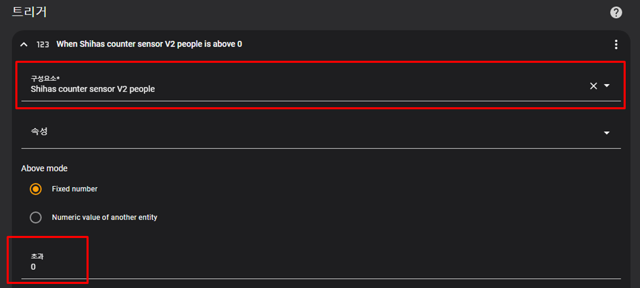 트리거(언제 실행할지) : 시하스 카운터 센서 선택 / 인원 0초과시