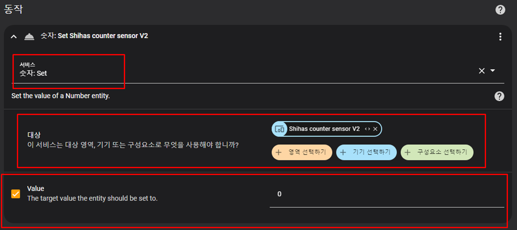 동작(무엇을 할지) : "서비스 - 숫자 : Set" -> 대상 - 시하스 카운터센서 선택 -> "Value : 0" 입력