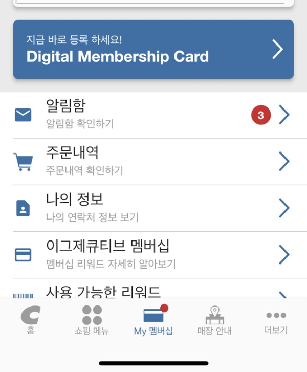 앱 하단부에 My 멤버십에 들어가면 마이페이지에 내 정보를 확인할 수 있고 그 밑에 "Digital Membership Card"라는 배너가 있을 것이다.