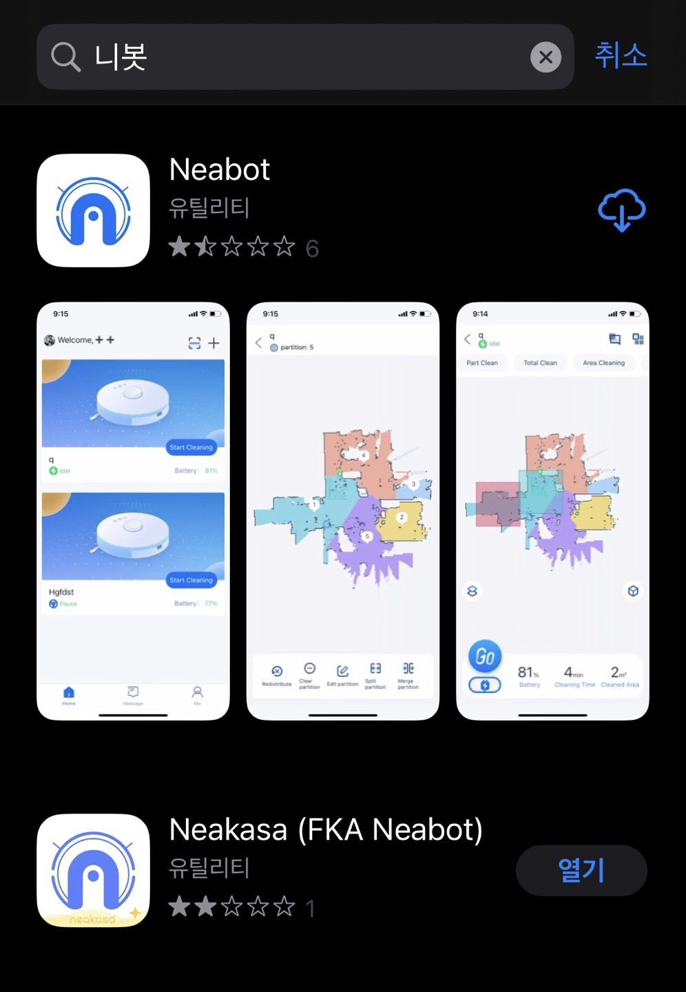 스마트폰에 니봇앱을 설치해 준다. App store기준으로 니봇을 검색하면 2개의 앱이 검색되는데 2개 다 설치해봤는데 둘 다 장치 등록 및 일반적인 사용에는 문제가 없는데 Neabot 앱의 경우 구글홈과 연동이 안돼서 Neakasa(FKA Neabot)을 설치해서 사용 중이다.