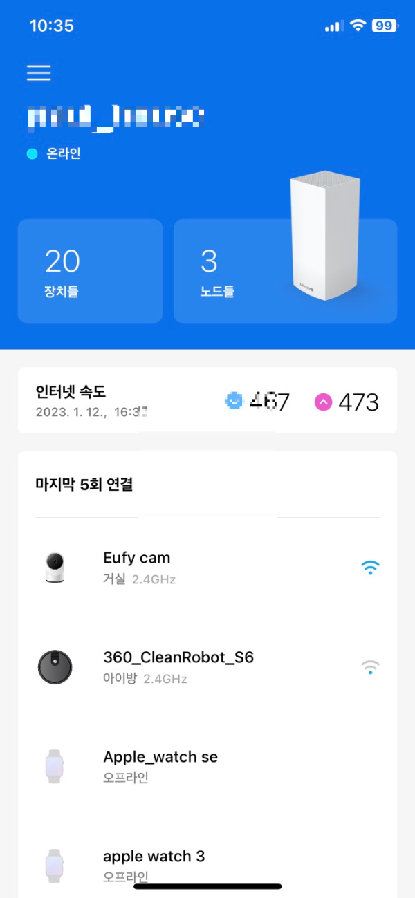 링크시스 앱의 첫 화면에는 현재 공유기가 온라인 상태인지, 연결된 장치 개수, 연결된 노드 개수, 이전 인터넷 속도 측정 결과, 가장 최근에 연결된 장치 상태를 확인 할 수 있다.