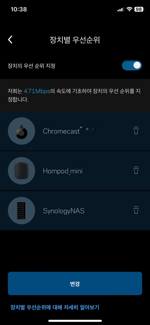우선순위는 주로 스트리밍 서비스를 이용하는 크롬캐스트와 Home Hub 역할을 하는 Homepod Mini, 데이터 서버 및 IOT 허브 역할을 하는 NAS의 경우에 높은 우선순위를 적용하고 있다. 데이터의 양이 많거나 연결의 안정성이 중요한 장치에 우선순위를 지정하여 사용하는 좋은 기능이다.