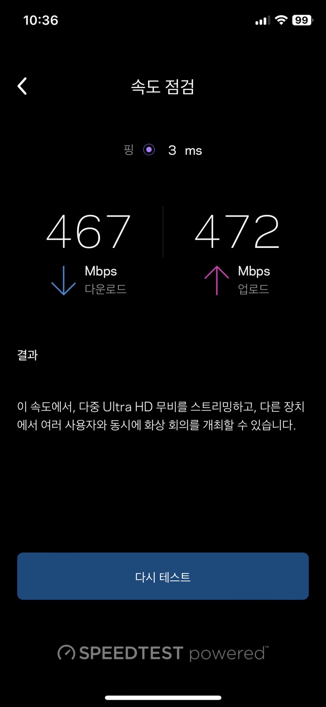 속도 측정은 보통 밴치비 앱이나 통신사 홈페이지와 같은 데에서 테스트를 하는데, 링크시스 앱에서 간편하게 속도를 측정할 수 있다.