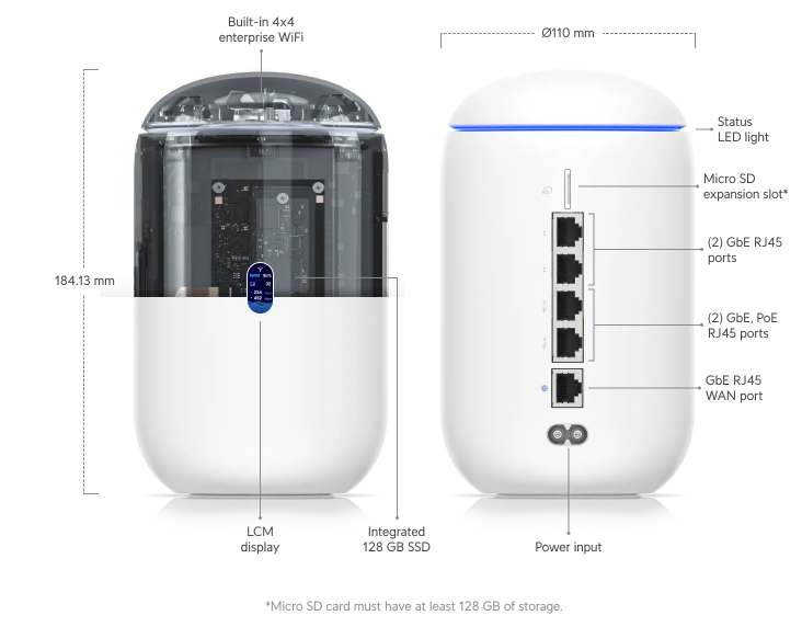 일반적으로 UNIFI의 제품들은 유선 공유기 기능과 무선 공유기 기능, 네트워크 관리가 분리되어 있어 네트워크를 구축할 때 여러 제품을 구매해야 하는데 UNIFI DREAM ROUTER(UDR)는 유, 무선 기능과 NETWORK관리 기능이 통합되어 있다.