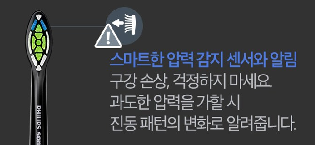 양치질을 할 때 자신도 모르게 강하게 할 수도 있는데 압력감지 센서가 있어서 진동패턴의 변화로 알려줘요.